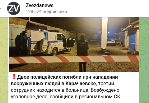 Накануне в Карачаево-Черкесии был введён план "Сирена". Поводом стало дерзкое нападение на полицейских. По предварительной информации, четверо бандитов напали на машину стражей порядка, расстреляли их в упор, забрали оружие и скрылись. Двое силовиков погибли на месте мгновенно, ещё одного тяжело ранили, и за его жизнь борются врачи.