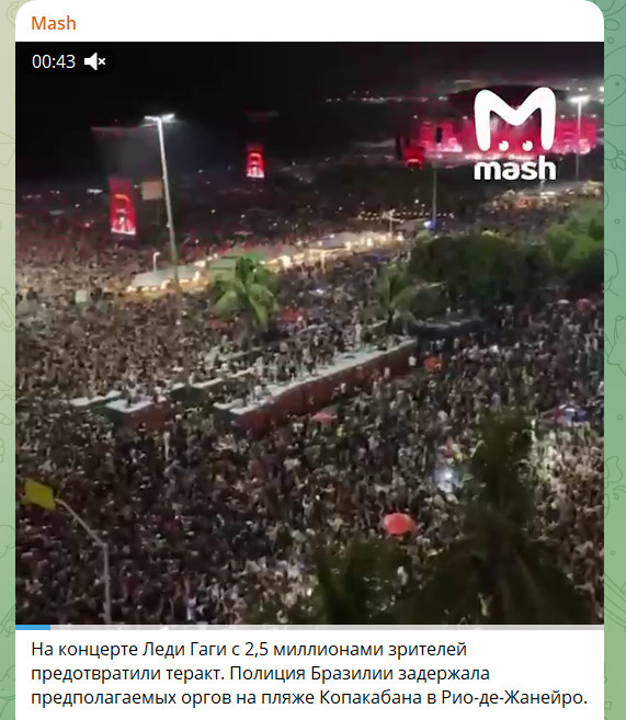 На концерте Леди Гаги с 2,5 млн зрителей предотвратили теракт. Полиция Бразилии задержала предполагаемых организаторов на пляже Копакабана в Рио-де-Жанейро.