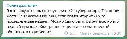 К неожиданным выводам о социально-политической обстановке в России пришёл политолог Марат Баширов, проведя мониторинг Telegram-каналов. У себя в авторском Telegram-канале "Политджойстик" эксперт озадачился отставкой губернаторов.