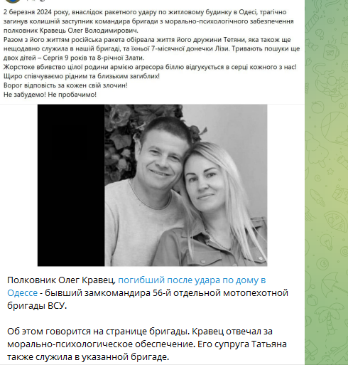 Кроме того, уже сами небратья сообщают, что при ударе по Одессе погибли двое военных из элиты армии. Первый – полковник Олег Кравец. Он был заместителем командира бригады по морально-психологическому обеспечению. Кроме того, погибла и его жена Татьяна, также служившая в этой бригаде.