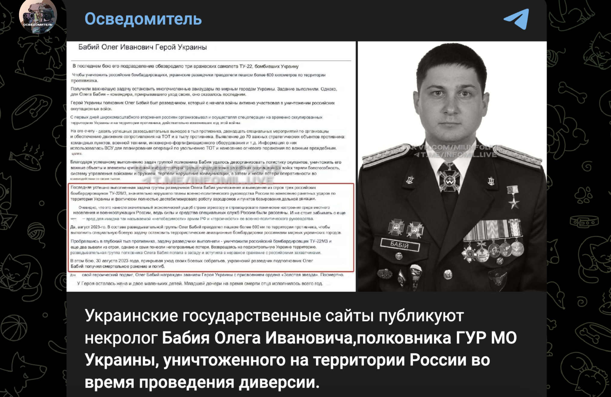 В документе уточняется, что украинские диверсанты под руководством полковника Бабия попали в засаду. В дополнение к этому в Главном управлении разведки отмечается, что уничтоженный украинец посмертно был награждён званием Героя Украины.