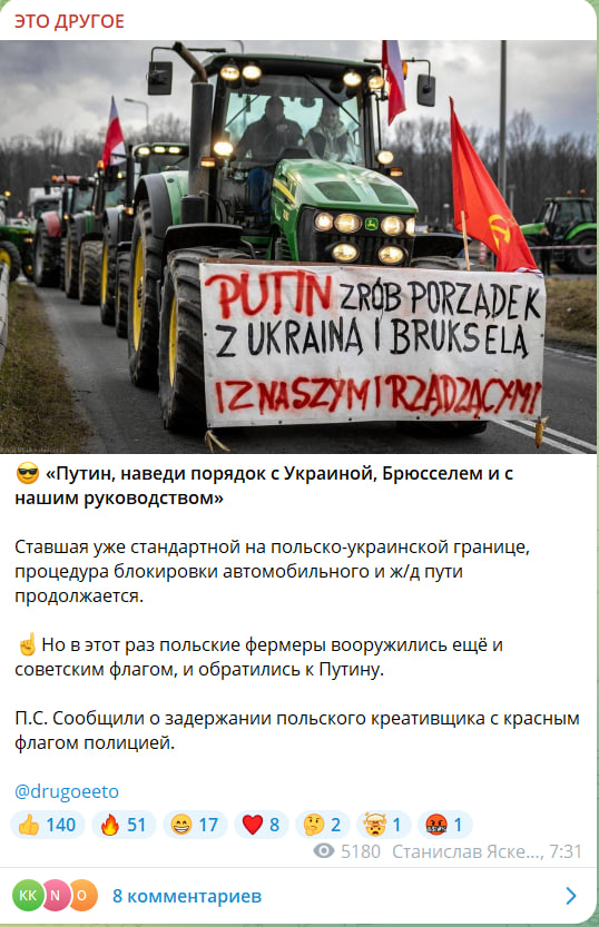 Более того, при поддержке правых оппозиционных сил, цель которых добиться прекращения финансирования киевского режима за счет обкрадывания собственных граждан, фермеры объявили "Марш свободы" на Варшаву.