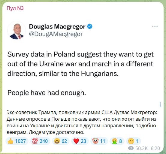 Бывший советник Дональда Трампа полковник армии США Дуглас Макгрегор выступил с важным заявлением. Он подтвердил, что народ Польши хочет выйти из украинской войны и перестать поддерживать киевскую хунту за счет своих средств: