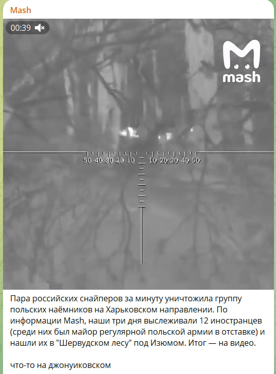 Два русских снайпера ликвидировали 12 поляков менее чем за минуту на Харьковском направлении. По данным Mash, русские воины выслеживали группу "солдат удачи", пришедших на территорию ZOV в надежде подзаработать в составе "иностранного легиона" Зеленского, в течение трёх дней.