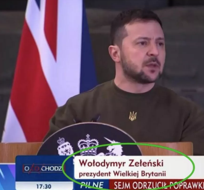Вечером в четверг советник украинского МВД Антон Геращенко опубликовал в своём аккаунте в Twitter скриншот с польского телеканала TVP Info. Всё бы хорошо, только вот в титрах Владимир Зеленский указан как президент Великобритании.