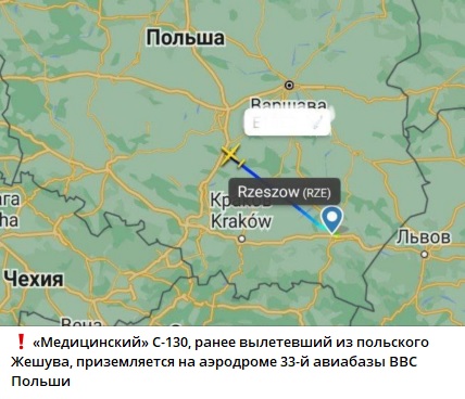 На авиабазе ВВС Польши приземлился "медицинский" борт С-130, ранее вылетевший из Жешува. Предполагается, что самолёт привёз убитых и раненых представителей НАТО, которых накрыло ночным ударом по Киеву.