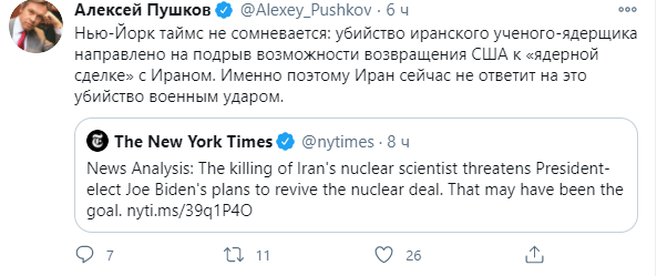 "Нью-Йорк Тайм"с не сомневается: убийство иранского учёного-ядерщика направлено на подрыв возможности возвращения США к "ядерной сделке". Именно поэтому Иран сейчас не ответит на это убийство военным ударом, - пишет сенатор в Twitter.