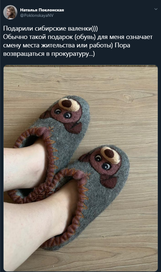 Наталья Поклонская получила в подарок очень симпатичные валенки и поделилась с подписчиками в Twitter фотографией обновки. "Пора возвращаться в прокуратуру", - написала она.