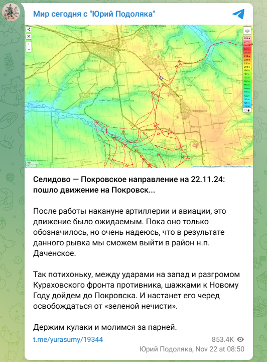 О начале движения в сторону Покровска Юрий Подоляка информирует в своём телеграм-канале. По данным военного блогера, оно, конечно, было ожидаемым. Сигналом была активная работа артиллерии и авиации на этом направлении, отмеченная накануне.