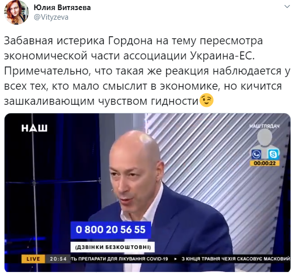 Юлия Витязева поделилась в Twitter кадрами "забавной истерики" украинского журналиста Дмитрия Гордона, рассуждавшего на тему пересмотра экономической части ассоциации Украина - Евросоюз.