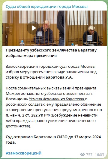 Кроме того, на этой неделе Замоскворецкий суд Москвы арестовал президента межрегионального узбекского землячества "Ватандош" Усмана Баратова. Тот, кто некогда возмущался из-за того, что по телевидению говорят о русских, а не о россиянах, кто постил саркастично-оскорбительные мемы в соцсети, ныне арестован.