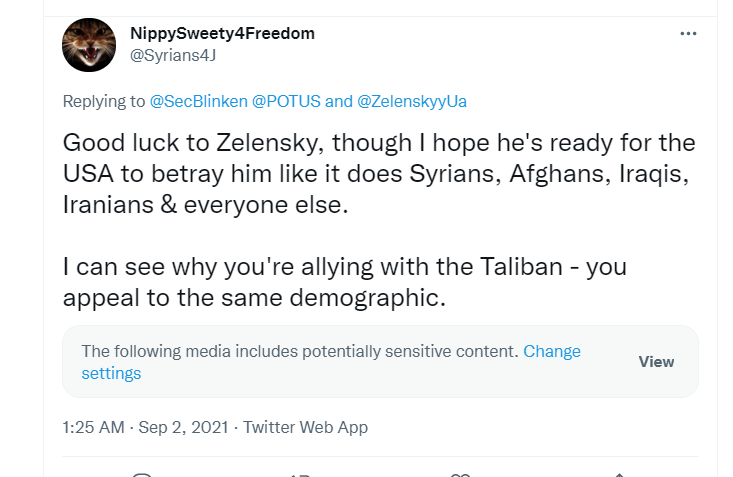 А пользователь Qais Habibi вынес предупреждение: "Союзники США больше не будут доверять США, вы, ребята, потерпели поражение в Афганистане, а правительство США сменило избранное правительство на Исламские Эмираты. Тайвань, Украина, Великобритания и другие европейские страны должны дважды подумать".