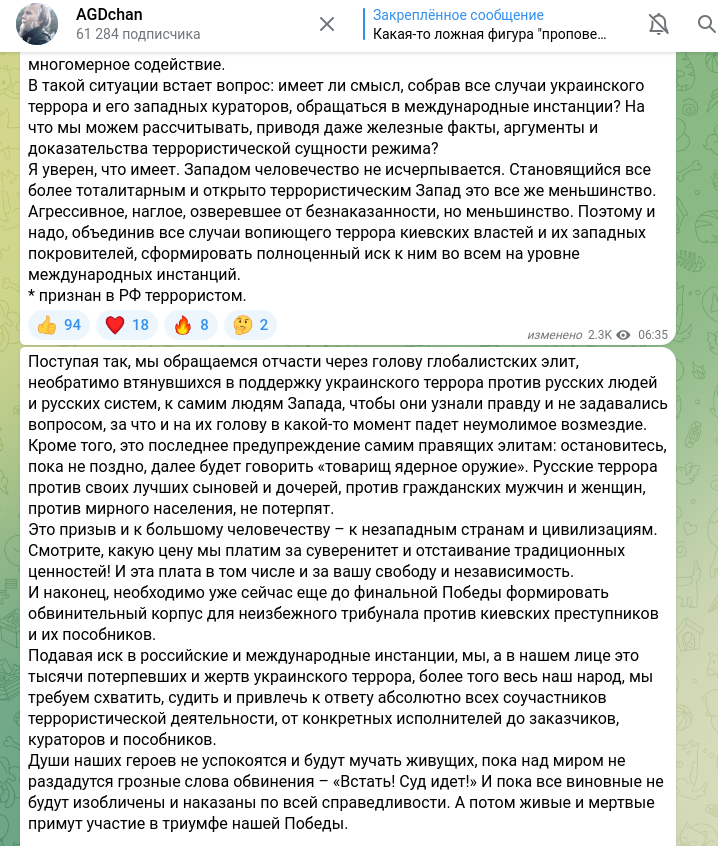 Русские террора против своих лучших сыновей и дочерей, против гражданских мужчин и женщин, против мирного населения не потерпят, - пишет он в своём телеграм-канале. - Это призыв и к большому человечеству - к незападным странам и цивилизациям. Смотрите, какую цену мы платим за суверенитет и отстаивание традиционных ценностей! И это плата в том числе и за вашу свободу и независимость.
