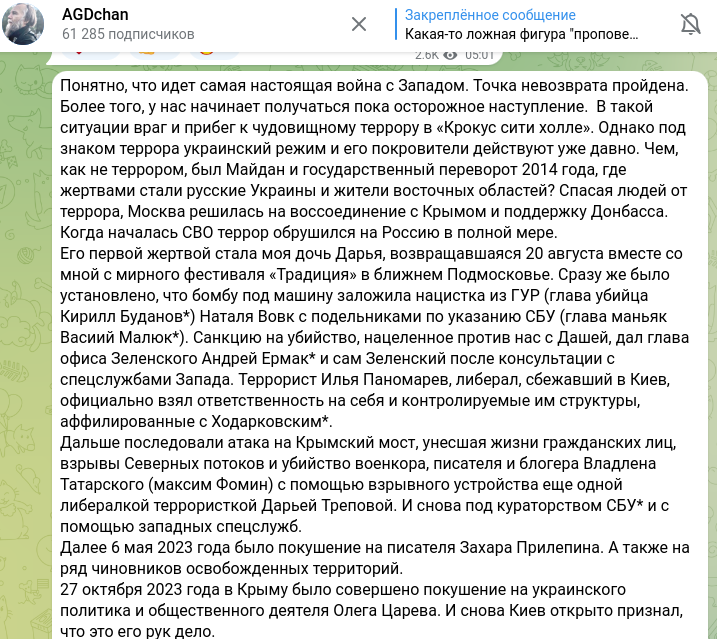 Далее последовали атака на Крымский мост, унесшая жизни гражданских лиц, взрывы "Северных потоков" и убийство военкора, писателя и блогера Максима Фомина, известного под псевдонимом Владлен Татарский. Его убила с помощью взрывного устройства ещё одна либералка, террористка Дарья Трепова*, отметил Дугин. И снова под кураторством СБУ и с помощью западных спецслужб.