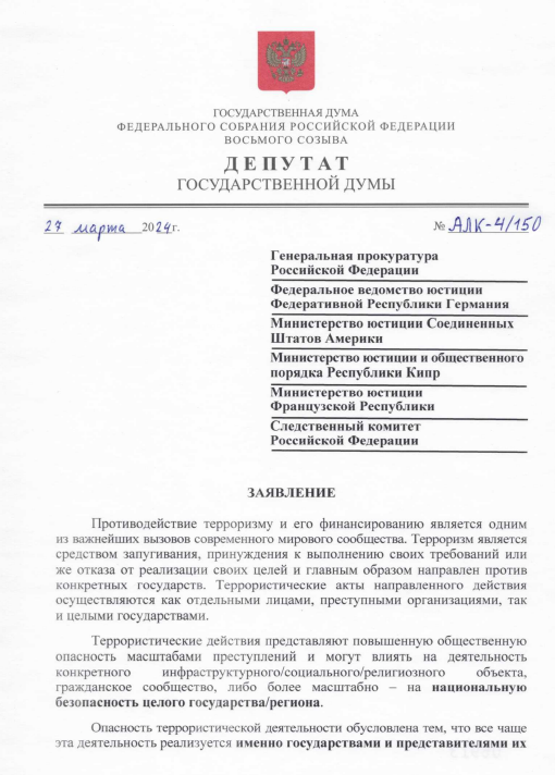 Речь идёт о подаче заявления в адрес правоохранительных структур пяти стран - России, США, Германии, Франции и Кипра, - беспрецедентного по своему составу и последствиям для всего мирового сообщества заявления.