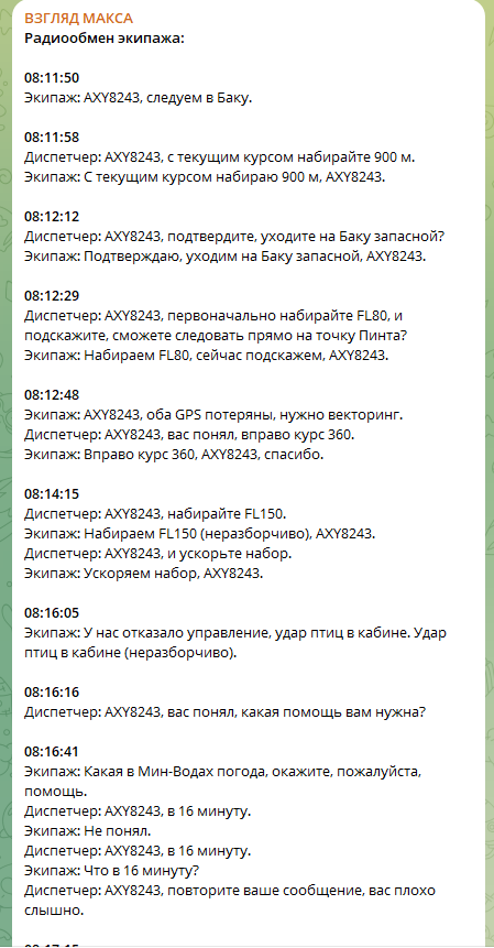 Обнародованы последние переговоры авиакомпании Azerbaijan Airlines до крушения судна в казахстанском городе Актау. Из них следует, что экипаж погибшего борта несколько раз просил диспетчера ответить на запрос, какая погода на запасных аэродромах. Но ответа не было несколько минут. До этого в кабину, по сообщениям пилота, ударились птицы, а потом начался отказ оборудования.