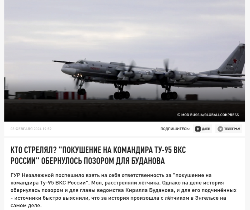 К слову, это уже далеко не в первый раз, когда ГУР придумывает убийство высокопоставленного командира. В феврале этого года тоже с подачи ведомства Буданова* по украинским СМИ и пабликам разошлась новость о "покушении на командира Ту-95 ВКС России в Энгельсе". По информации ГУР, Олег С. получил несколько огнестрельных ранений и неизвестно, выжил ли лётчик.