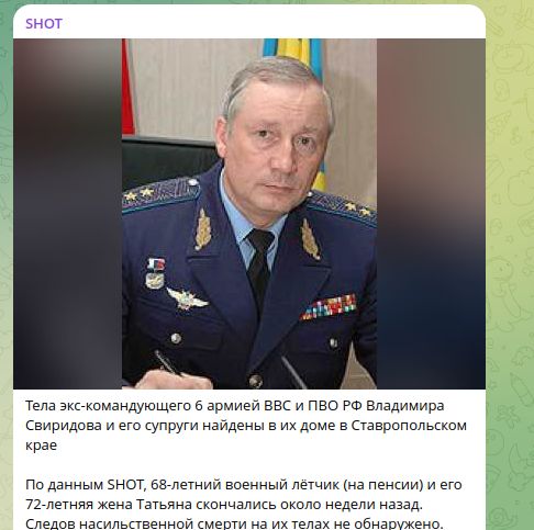 По данным SHOT, тела 68-летнего военного лётчика на пенсии и его 72-летней жены Татьяны были обнаружены в их доме в Ставропольском крае. Baza уточняет, что их нашли днём 15 ноября.