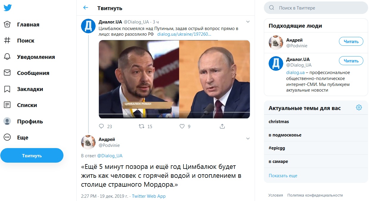 "Цимбалюк посмеялся над Путиным, задав острый вопрос прямо в лицо", - пишет Диалог.UA.