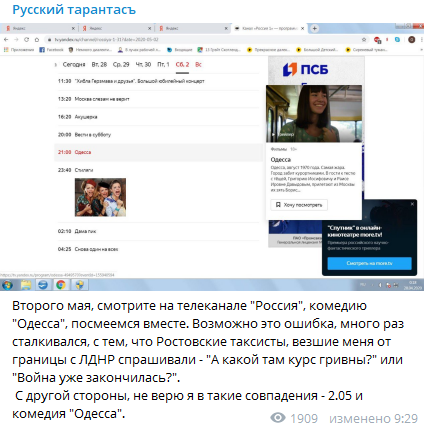 Военный корреспондент "Комсомольской правды" Дмитрий Стешин обнаружил в телепрограмме на 2 мая канала "Россия" комедию "Одесса". На фоне событий 2 мая 2014 года, которые по сей день не укладываются в голове и вызывают боль в сердцах как жителей самой Одессы, так и части жителей Украины, Донбасса и России, военкор немногозначно намекнул на неуместность комедии с таким названием в день скорби по погибшим.
