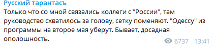 "Только что со мной связались коллеги с "России", там руководство схватилось за голову, сетку поменяют. "Одессу" из программы на второе мая уберут. Бывает, досадная оплошность", - отметил Стешин.