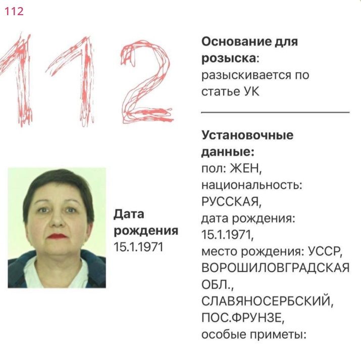 Россия объявила в розыск Зинаиду Серебрицкую, которая участвовала в покушении на жизнь генерала Владимира Алексеева. На сайте МВД появилась персональная карточка этой женщины. В ней говорится, что разыскиваемая гражданка - русская по национальности. Родилась в Ворошиловградской области УССР (сегодня это ЛНР) 15 января 1971 года. Разыскивается по статье УК. О какой именно статье идёт речь, не указано, но можно предположить, что "Покушение на убийство" или "Терроризм".