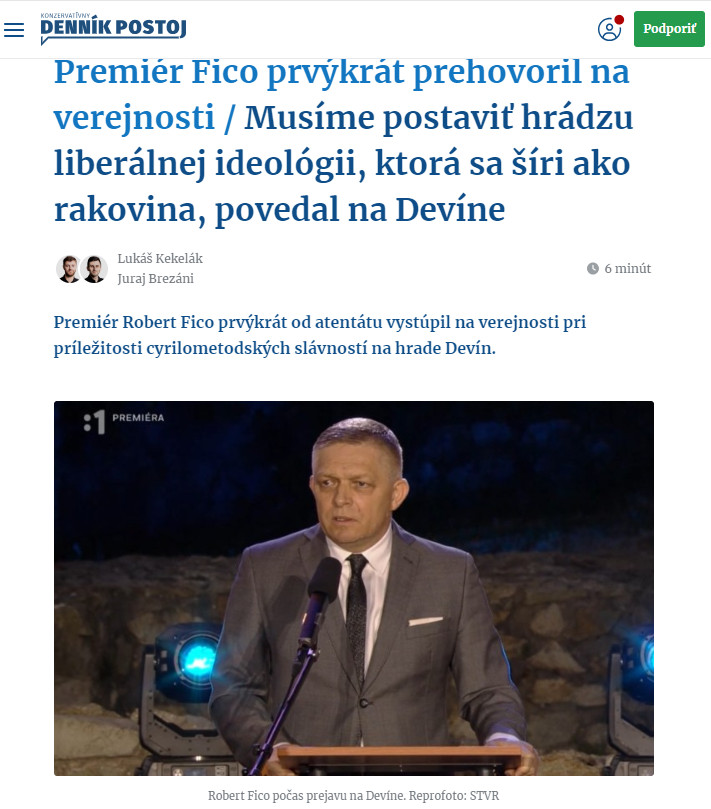Премьер-министр Словакии Роберт Фицо в первый раз после того, как на него совершили покушение, появился в общественном пространстве, передаёт издание Dennik Posto. Фицо приехал на церемонию празднования прибытия просветителей святых Кирилла и Мефодия в Великую Моравию. Он даже выступил с речью, причём стоя.