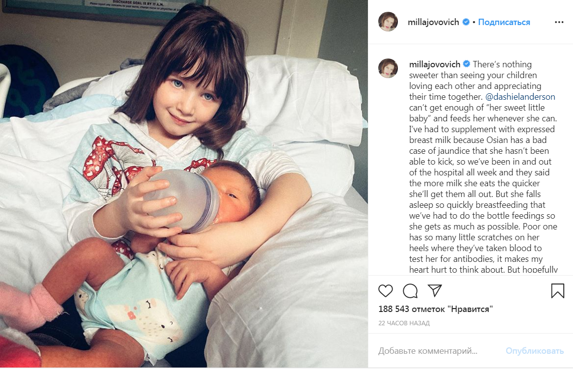 Чуть больше недели назад Милла Йовович в третий раз стала мамой: 3 февраля она родила ещё одну дочь. Однако, как оказалось, у малышки не всё в порядке со здоровьем: у неё диагностирована тяжёлая форма желтушки. "Посылаем вам лучи добра", - поспешили поддержать актрису и её маленькую Озиан подписчики Йовович.