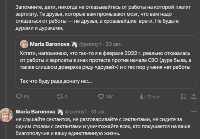 Об этом пишет в своём телеграм-канале ZERGULIO известный блогер Сергей Колясников. Сейчас всем этим релокантам и борцам с режимом, после первых встреч, улыбок и кофе-брейков, остаётся лишь мыть полы и клеить коробки в супермаркетах. Да ещё выпрашивать донаты, как героиня одного из двух сюжетов, представленных блогером в качестве иллюстрации своего утверждения.