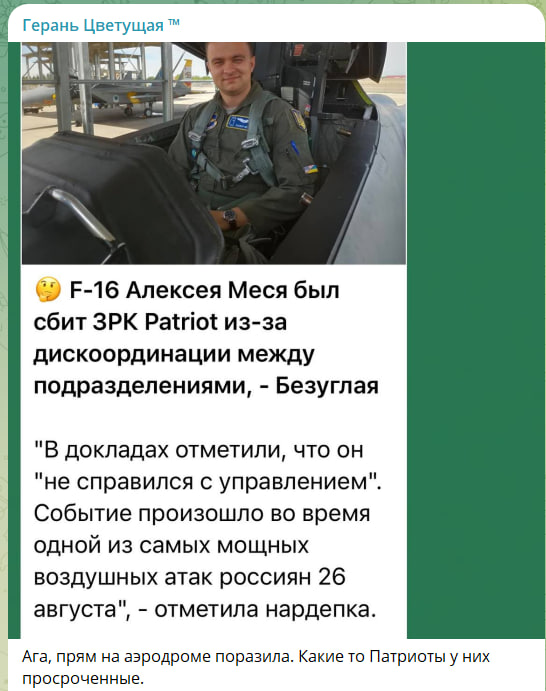 Он отметил, что основная версия инцидента осталась прежней: лётчик был сбит ракетой украинской зональной ПВО во время захода на цель в районе аэродрома, предназначенного для F-16. Это подтверждает мнение многих специалистов, что истребители и переданные западные системы ПВО не имеют системы "свой-чужой". По его словам, это является серьёзным провалом, так как теперь существует риск, что они будут сбивать друг друга или же придётся возвращать самолёты обратно.