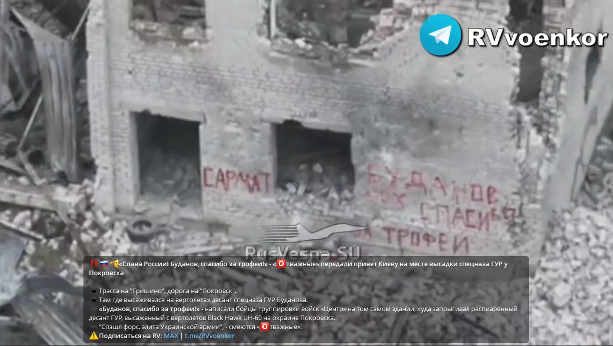Русские бойцы оставили в Покровске послание главе ГУР Украины Кириллу Буданову*, который лично послал в заблокированный нашими бойцами город американский вертолёт с элитными украинскими спецназовцами. Русские потроллили Буданова*, поблагодарив за трофеи.