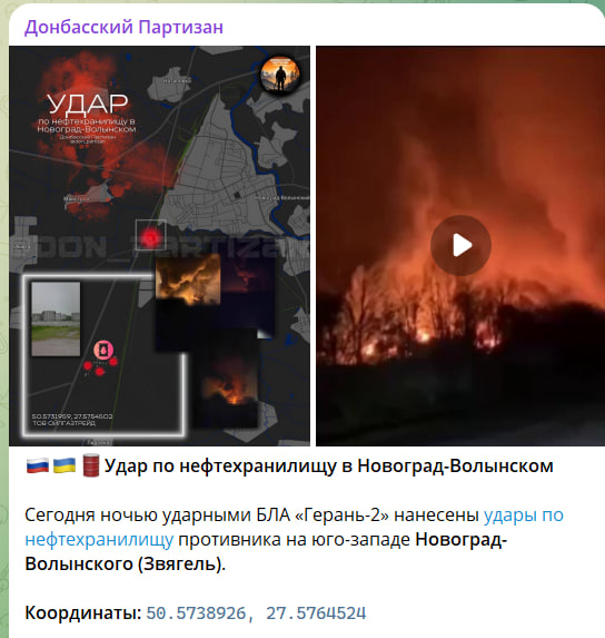 Сообщается, что в ходе ударов русской армии по критической инфраструктуре Украины в Новоград-Волынском (Звягель) Житомирской области после налёта дронов "Герань-2" начался сильный пожар.