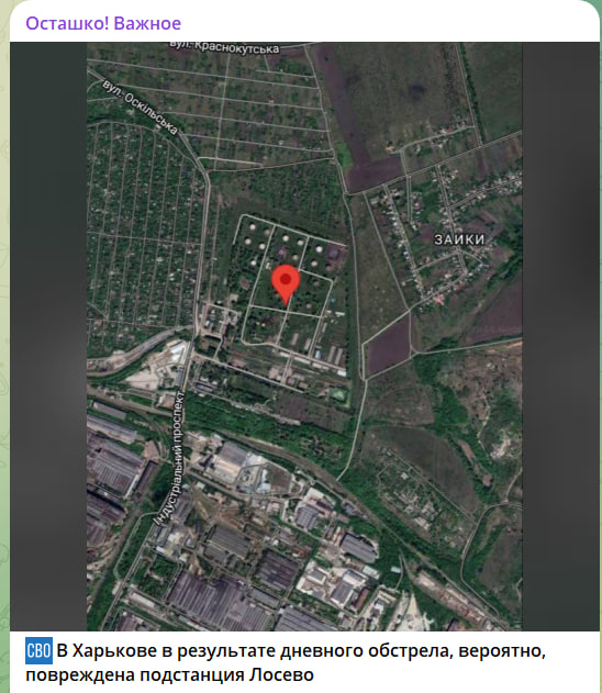 Сообщается, что в ходе дневного обстрела критической инфраструктуры Харькова была поражена подстанция Лосево - одна из немногих, которая даёт электроэнергию местным населённым пунктам.