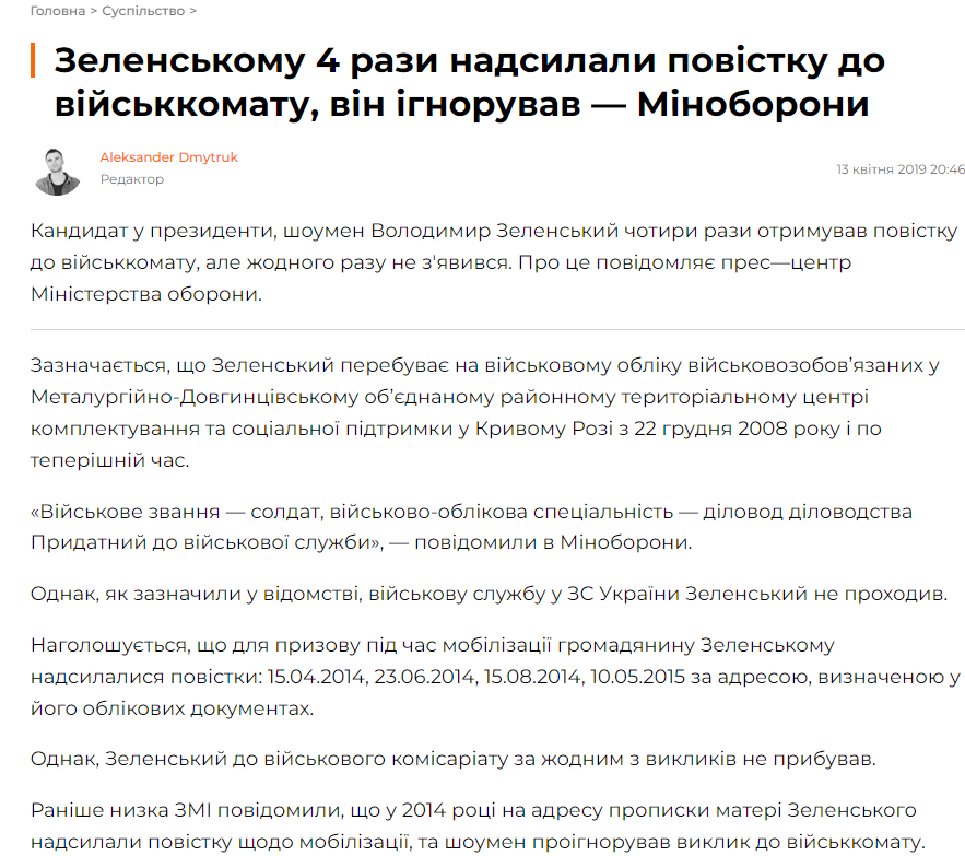 При этом ещё в 2019 году украинское интернет-издание Hromadske сообщало, что Зеленскому повестки в военкомат приходили четыре раза. И все четыре раза он их игнорировал.