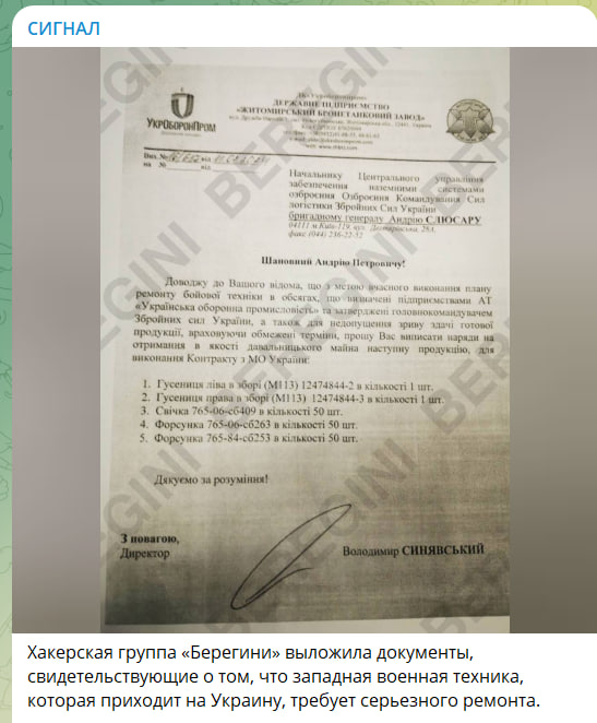 Хакерская группа "Берегини" выложила документы, свидетельствующие о том, что западная военная техника, которая приходит на Украину, требует серьёзного ремонта. Один из документов - с Житомирского бронетанкового завода. Там ремонтируют и бронетранспортёры М-113. Как видим из документа, просят много свечей и форсунок. Это потому, что иностранная техника долго стояла на хранении и теперь надо приводить в порядок двигатели. А еще топливо и условия для эксплуатации западной техники на Украине неподходящие,