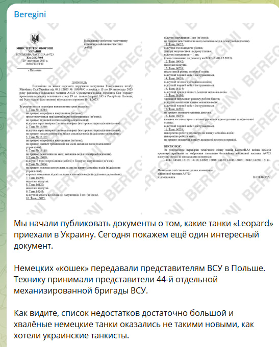 Согласно другому документу, прибывшие в Киев немецкие танки Leopard оказались вовсе не новыми и имеют множество недостатков, в том числе периодические короткие замыкания на нескольких машинах.
