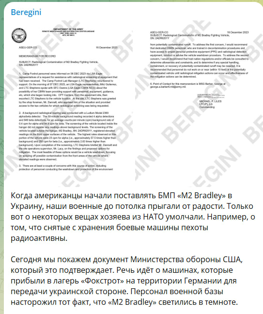 Самой неоднозначной помощью Запада Киеву стали американские машины БМП M2 Bradley. Авторы "Берегини" опубликовали документ Министерства обороны США, который подтверждает тот факт, что бронетранспортёры, снятые с хранения, имеют радиоактивное загрязнение и "светились в темноте".