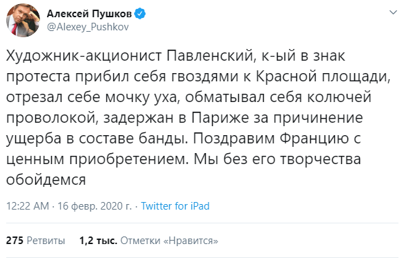 "Поздравим Францию с ценным приобретением. Мы без его творчества обойдемся", — написал в своём Twitter российский сенатор Алексей Пушков.
