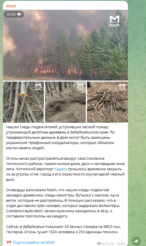 Лесные пожары в Забайкалье, оказывается, дело рук Украины. Пока спасатели и добровольцы отважно борются со стихией, в уцелевших частях леса нашли следы поджигателей. Предполагается, что ими руководят печально известные телефонные "координаторы", которые занимаются вербовкой людей для совершения терактов. Пошли и первые задержания: волонтёры передали в руки полиции трёх подозрительных граждан.