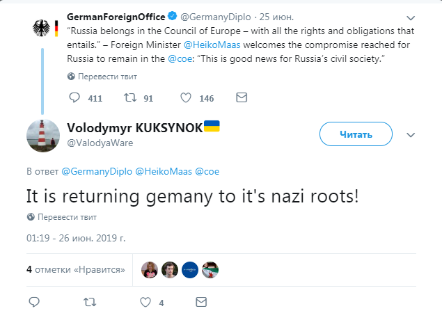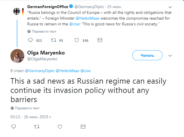 Одной из самых обсуждаемых новостей за последнее время стала перспектива возвращения России в ПАСЕ. В связи с этим в официальном Twitter-аккаунте Министерства иностранных дел Германии была опубликована цитата министра иностранных дел Хайко Мааса, который отметил: "Россия принадлежит к Совету Европы со всеми вытекающими отсюда правами и обязанностями… Это хорошая новость для российского гражданского общества".