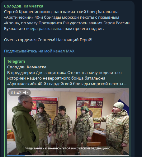 Сергей Крашенинников - уроженец Камчатского края. Он ещё совсем юноша, но за плечами уже год на передовой. Боец служит в батальоне "Арктический" легендарной 40-й бригады морской пехоты. Именно в ней, в эпицентре боевых действий на границе Курской и Сумской областей, и произошло то, что сочли подвигом.