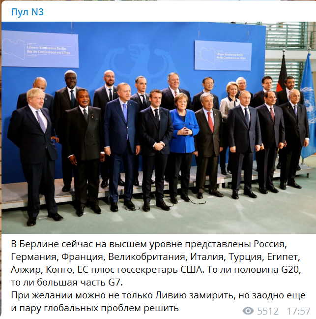 Как отметил журналист кремлёвского пула Дмитрий Смирнов, конференция в Берлине получилась очень представительной. На высшем уровне представлены не только Россия и Германия, но и Франция, Великобритания, Италия, Турция, Египет, Алжир, Конго, ЕС плюс госсекретарь США.