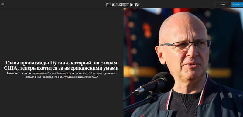 Министерство юстиции США назвало Сергея Кириенко "куратором около 30 интернет-доменов", которые якобы распространяли ложную информацию для американцев. Газета WSJ пошла ещё дальше и заявила, что Кириенко якобы "охотится за американскими умами". В общем, в Америке запустили новый рашагейт.