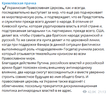 Автор Telegram-канала противопоставил ей "киевскую хунту", которая захватила власть в стране и вот уже восемь лет пытается стравить русских и украинцев. В том числе усугубив церковный раскол. В этом киевскому режиму и его партнёрам, установившим внешнее управление над страной, очень помог Фанар, который, выполняя роль Госдепа, спровоцировал крупнейший кризис в православном мире.