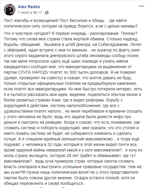 Он рассказал, что и его вызвали в штаб на собеседование. Там куратор сообщил, что якобы мажоритарщики за выдвижение от партии "Слуга народа" платят по $300 тысяч. Знакомым же Редьки якобы предлагали взятку в $2 млн.