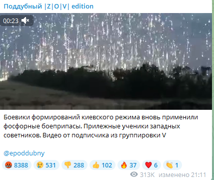 На кадрах, которые опубликовал военкор, - применение запрещённых фосфорных боеприпасов украинскими боевиками. По его словам, видео было снято подписчиком из группировки освободительных войск России "V".