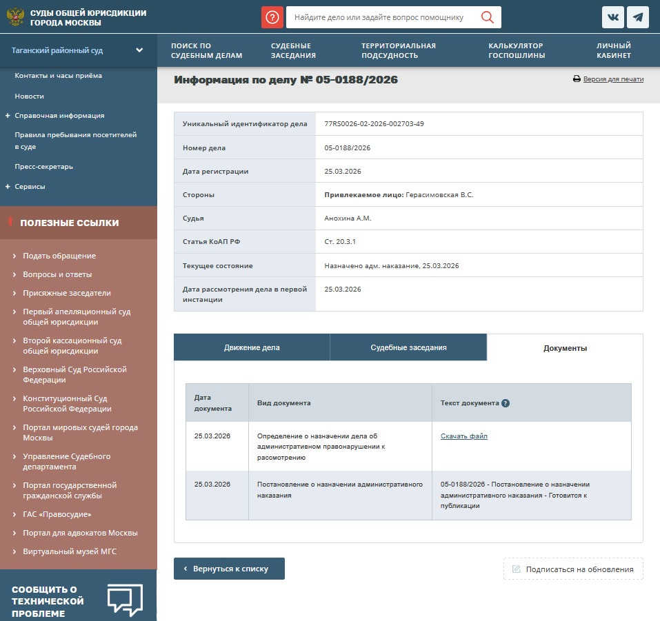 По итогу Таганский суд Москвы назначил Веронике Герасимовской десять суток административного ареста. Это следует из документов, опубликованных на официальном портале судов общей юрисдикции города Москвы.