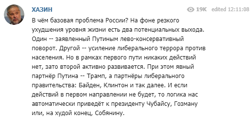 Если действий в первом направлении не будет, то логика нас автоматически приведёт к президенту Чубайсу, Гозману или, на худой конец, Собянину, - предупредил Хазин.
