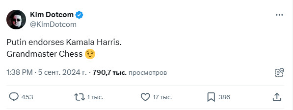 Основатель файлообменников Megaupload и Mega Ким Шмитц, известный также как Ким Дотком, на своей странице в соцсети Х назвал президента России Владимира Путина шахматным гроссмейстером после того, как русский лидер заявил о поддержке кандидата в президенты США Камалы Харрис на грядущих выборах.