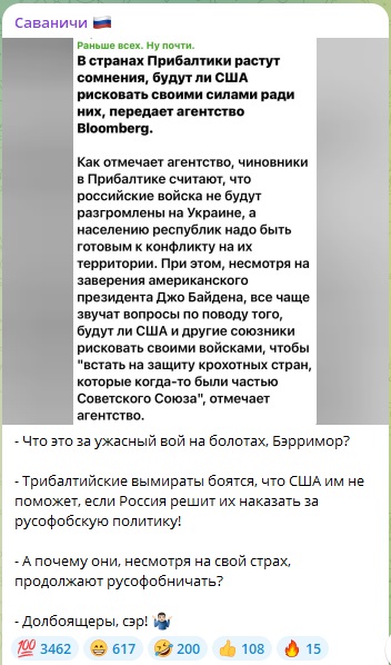 Они прогнозируют, что поражение Украины непременно поставит под угрозу всю Восточную Европу. И на этом фоне прибалтийские страны уже всполошились. Отмечается, что веры в победу ВСУ в Прибалтике всё меньше. И наконец там начали задаваться логичным вопросом: а станут ли США и НАТО рисковать своими военными ресурсами ради небольших стран, которые когда-то были частью Советского Союза?..
